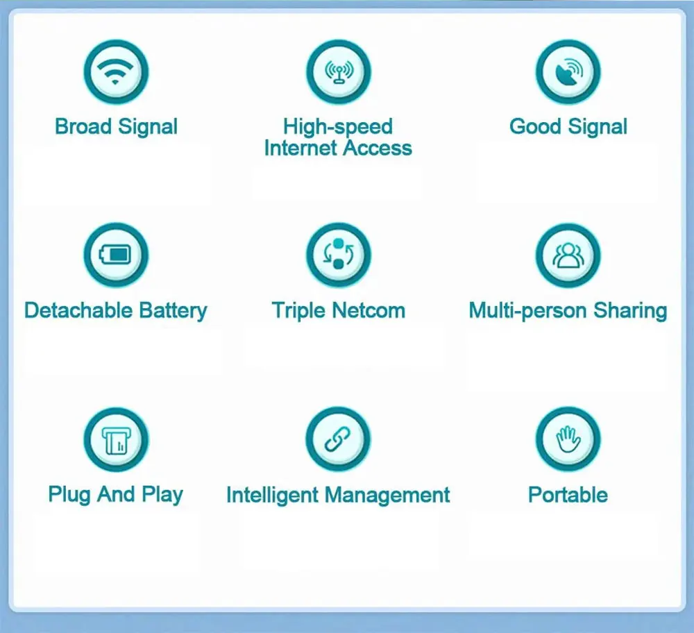 Function Selling Point:Broad Signal–Intelligent identificationof each signal is suitable for the device/High-speedInternet Access–4G Internet speedup to 150MBps.Good Signal–Can maintain a good signal even in mountainous areas/Detachable Battery–Detachable 2000mAh polymer lithium battery Triple Netcom–Telecom, Mobile, China Unicom are applicable