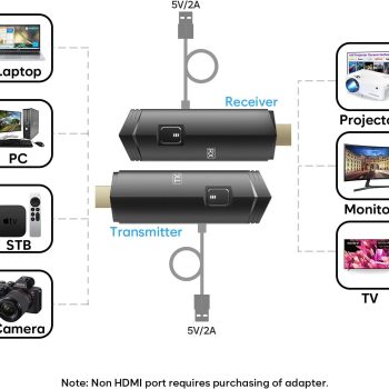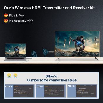 • [Plug & Play] No need any APP, simple connection can get the convenience of wireless streaming media. No software or WiFi connection required. Get up and running in 10 second with a true plug-and-play experience. Which solves the problems for the traditional HDMI cable connection and wiring trouble, aesthetics affecting and the short transmission distance. Connect the transmitter to the HDMI source, then connect the receiver to the HDTV/Projector , connect the power, and you are ready to go.