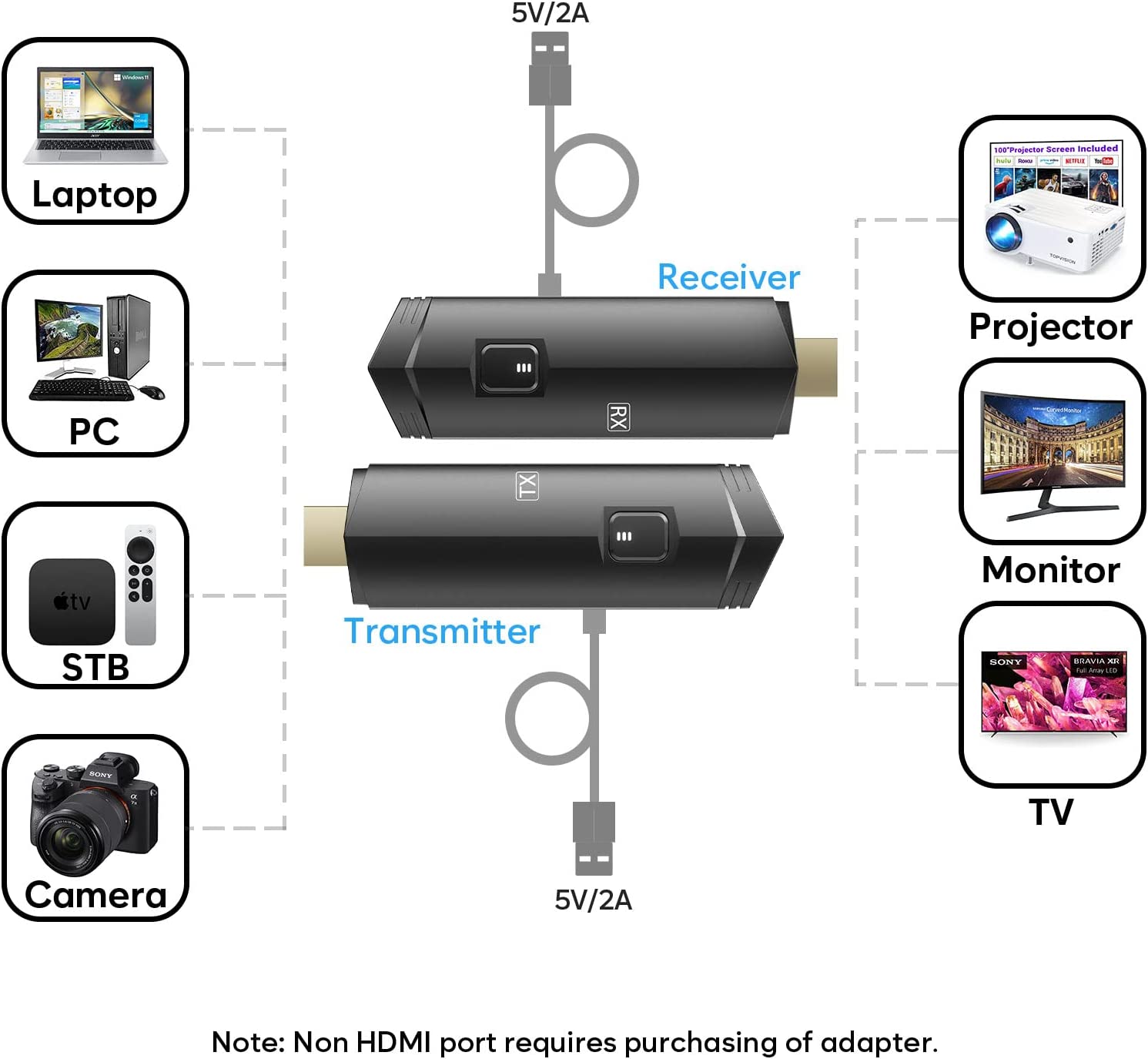 Wireless HDMI Transmitter and Receiver, Wireless HDMI Extender Kit,Designed for Laptops,PC,HDMI Dongle Adapter,Support 2.4/5GHz for Streaming Video/Audio from Laptop, PC to HDTV/Projector